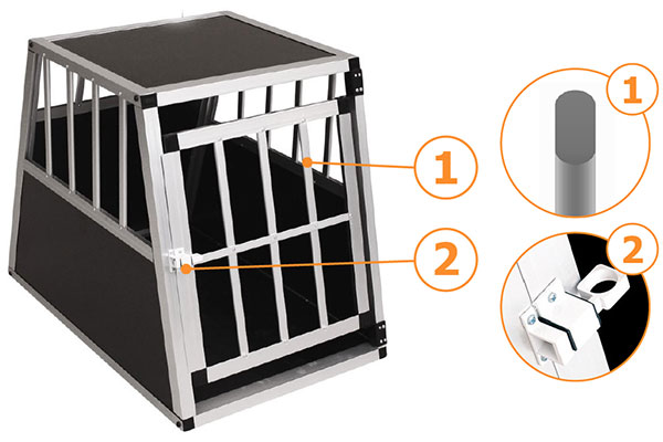 Bemærk hængslerne og tremmerne på hundeburet. De er ekstra kraftige, og er blot ét eksempel på at buret er lavet i solide, kraftige og sikre materialer. Herudover er tremmerne væsentligt mere massive end på andre mærker, og selv siderne af buret er lavet af ekstra tykke high density fiberboards.